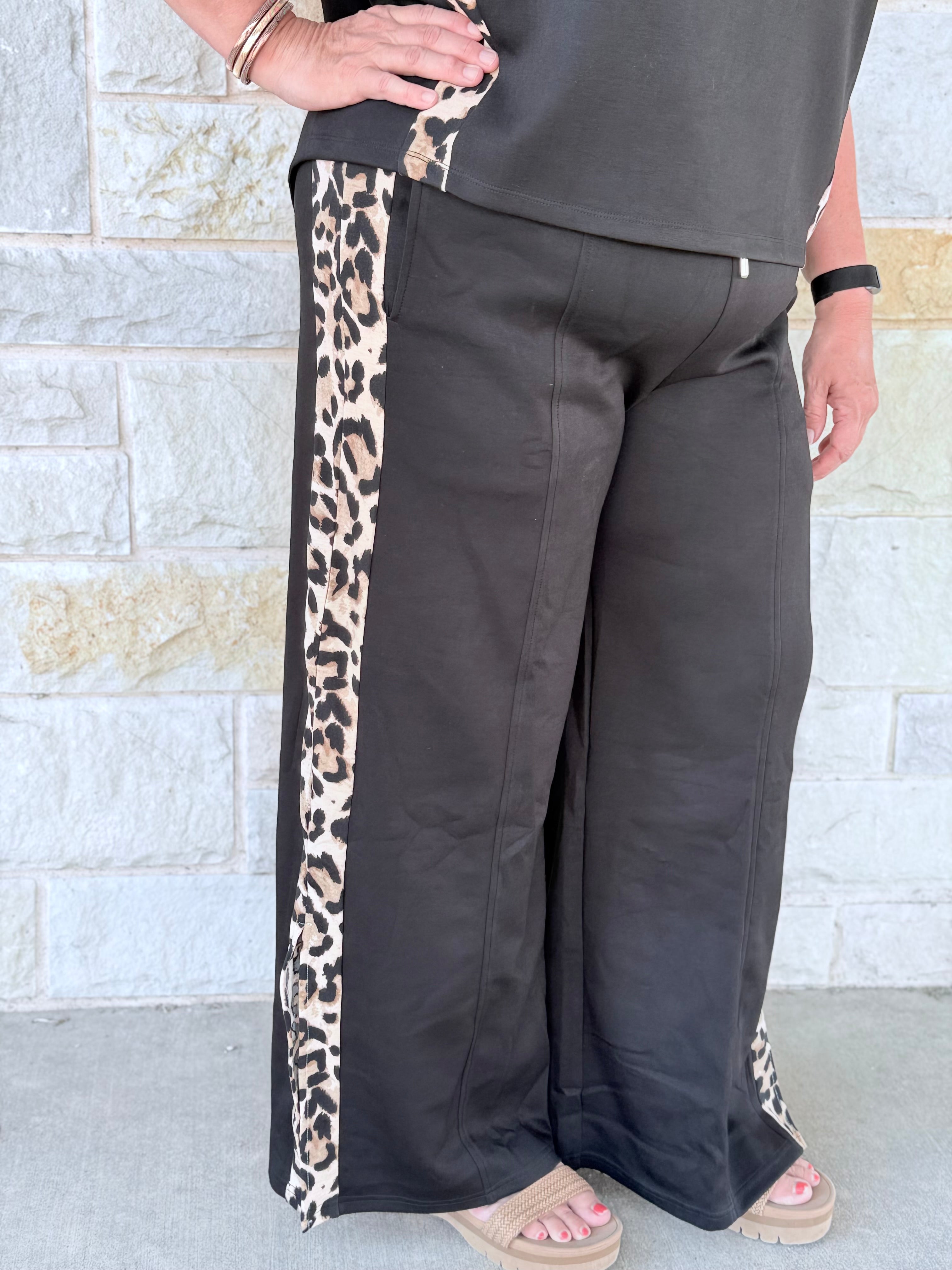 Ento Solid high-waist drawstring elasticated waistband pull-on long pants featuring leopard pattern contrast accent detailing. Side pockets. Unlined. Knit. Non-sheer. Lightweight.