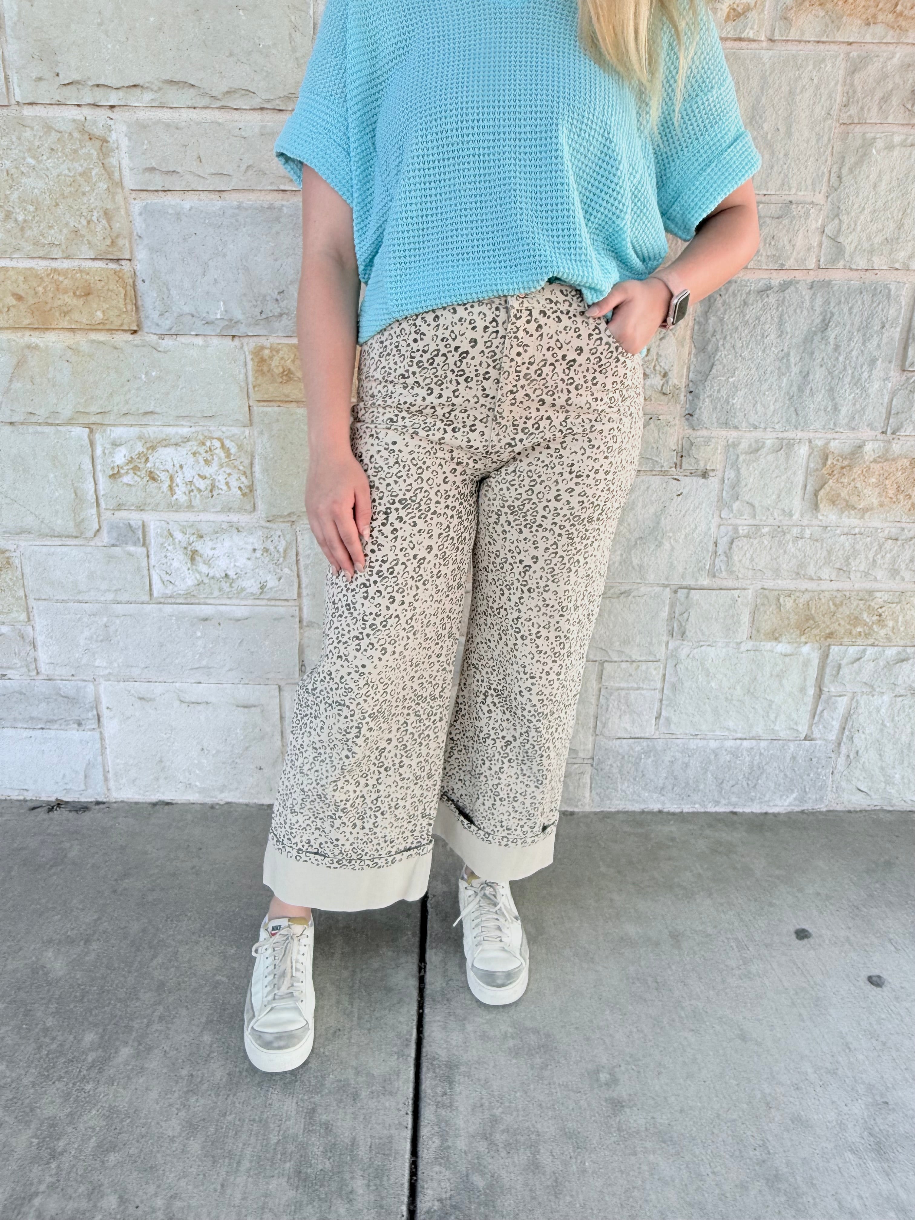 Leopard print high waist wide leg pants featuring front patch pockets and cuffed hem. Zip fly with button closure. Unlined. Woven. Non-sheer. Lightweight