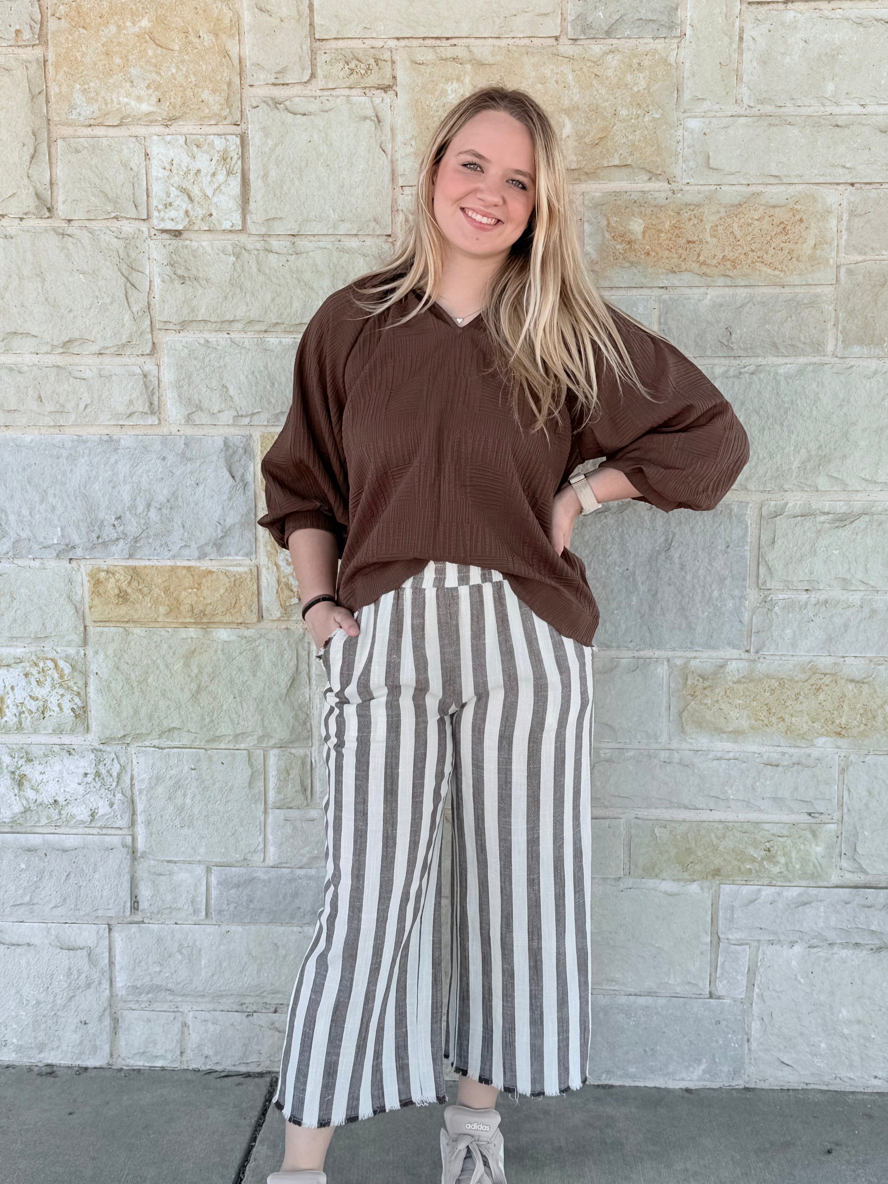 Elevate your wardrobe with these Linen Striped Waistband Pants, featuring a flattering wide-leg silhouette and thoughtful fray details for subtle texture. Crafted with convenience in mind, they include side pockets and are easy to care for with a regular wash. Perfect for a refined, effortless look that seamlessly transitions from day to night.