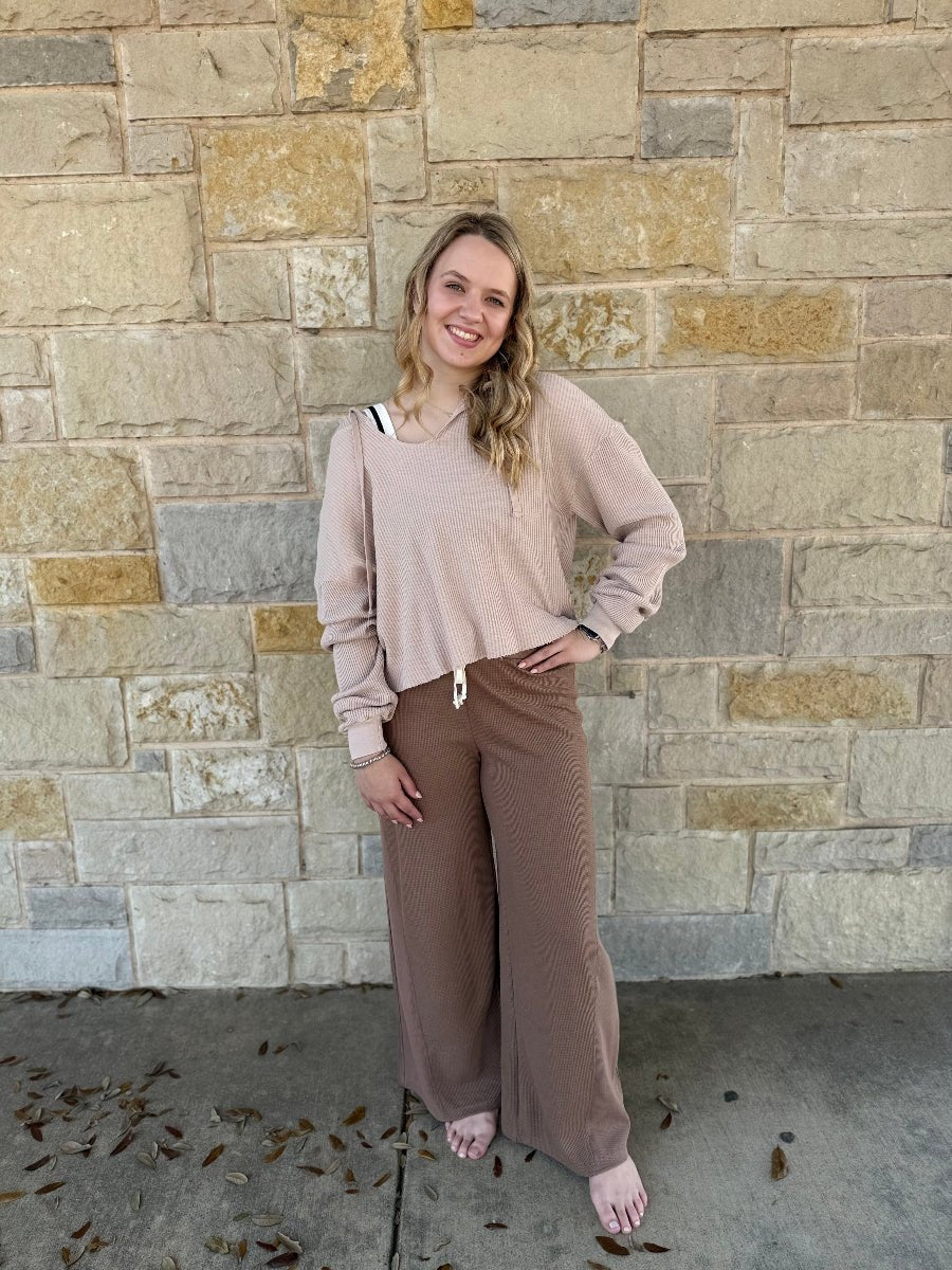 Experience comfort and style with this cropped waffle knit hoodie. Featuring a relaxed fit, this hoodie is perfect for layering or wearing on its own. The waffle knit texture adds a touch of coziness, while the cropped length offers a modern look. Complete with a hood and drawstring detail, this hoodie is ideal for casual outings or lounging at home. Pair it with high-waisted leggings or jeans for a chic, laid-back ensemble.