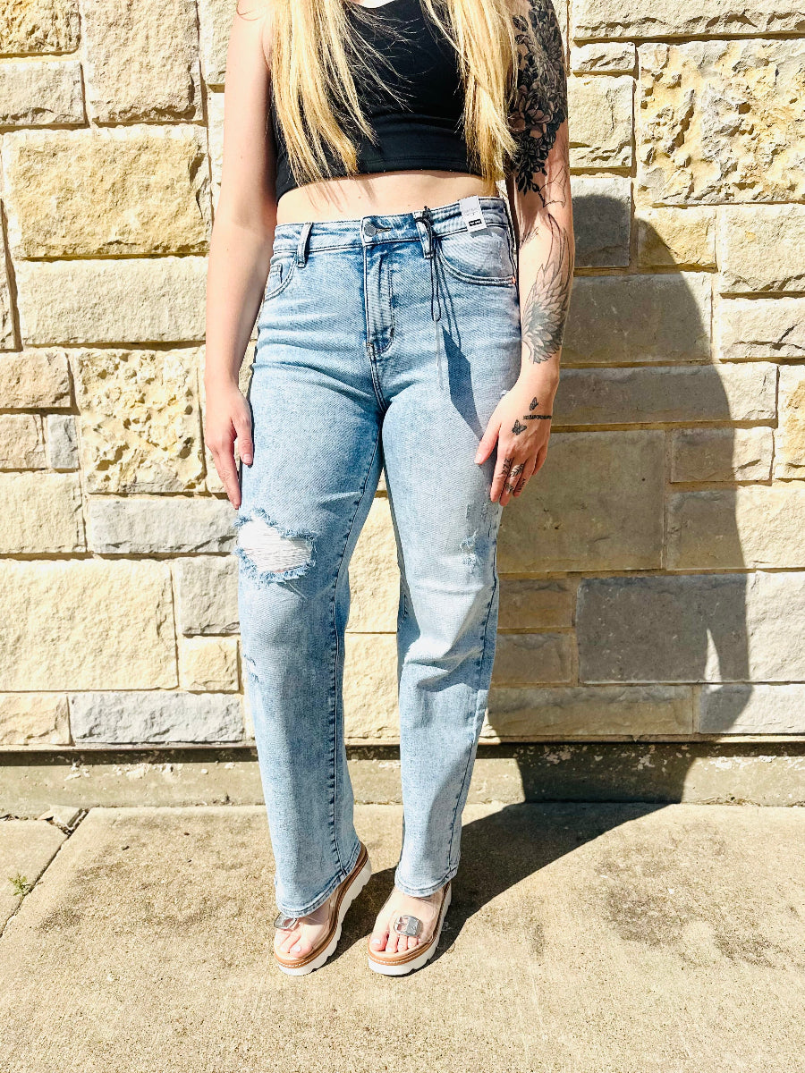 Elevate your denim game with our Judy Blue High Waisted Mineral Wash Destroyed 90's Straight Jeans. These jeans feature a vintage-inspired mineral wash and stylish destroyed detailing for a unique, edgy look. With a high waist, they offer a flattering fit for all body types. Perfect for any fashion-forward individual looking to make a statement.