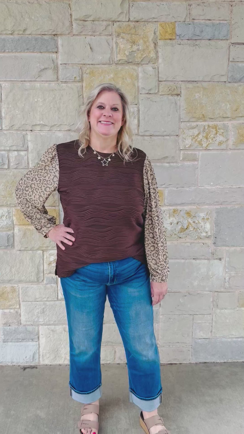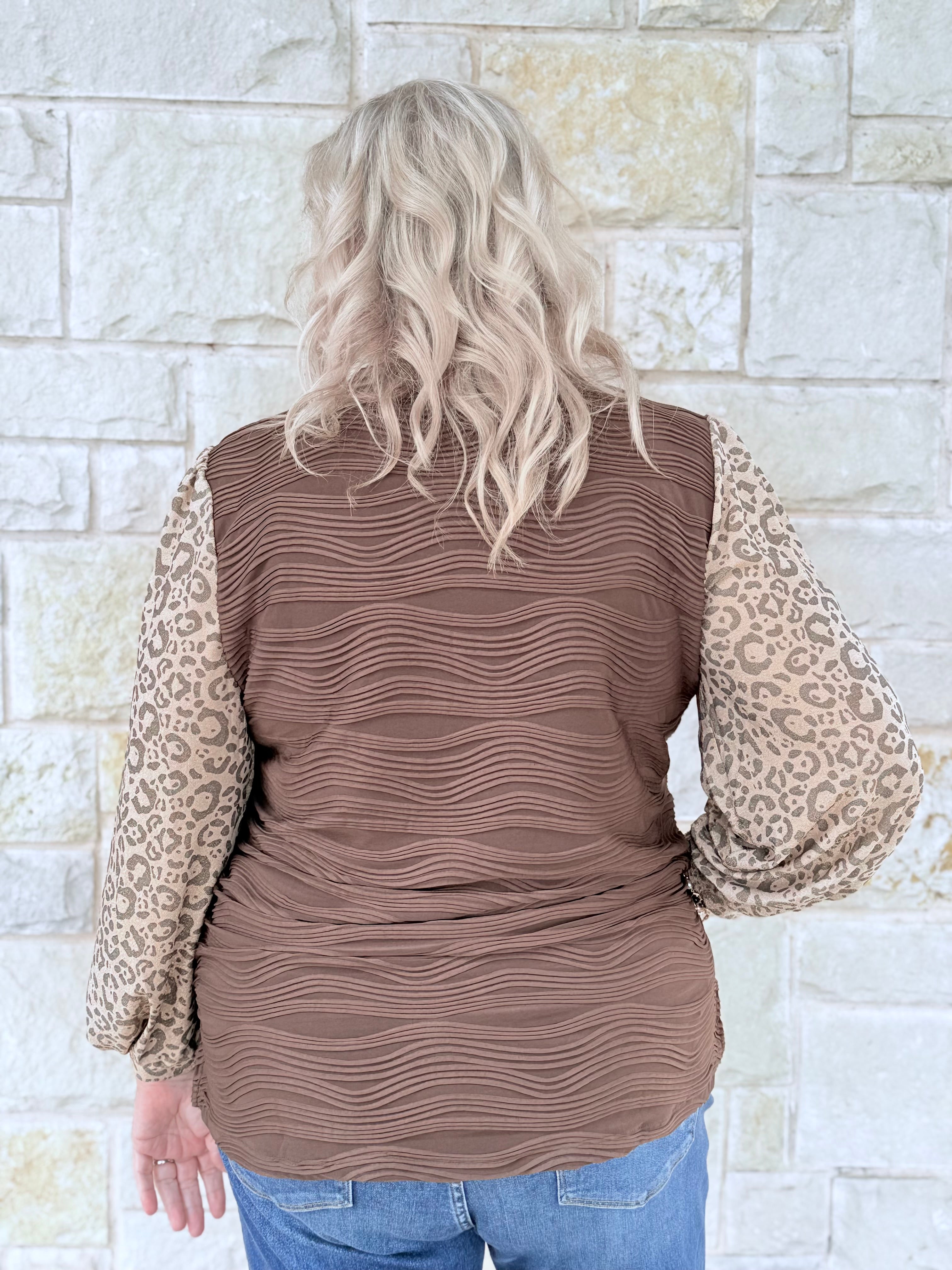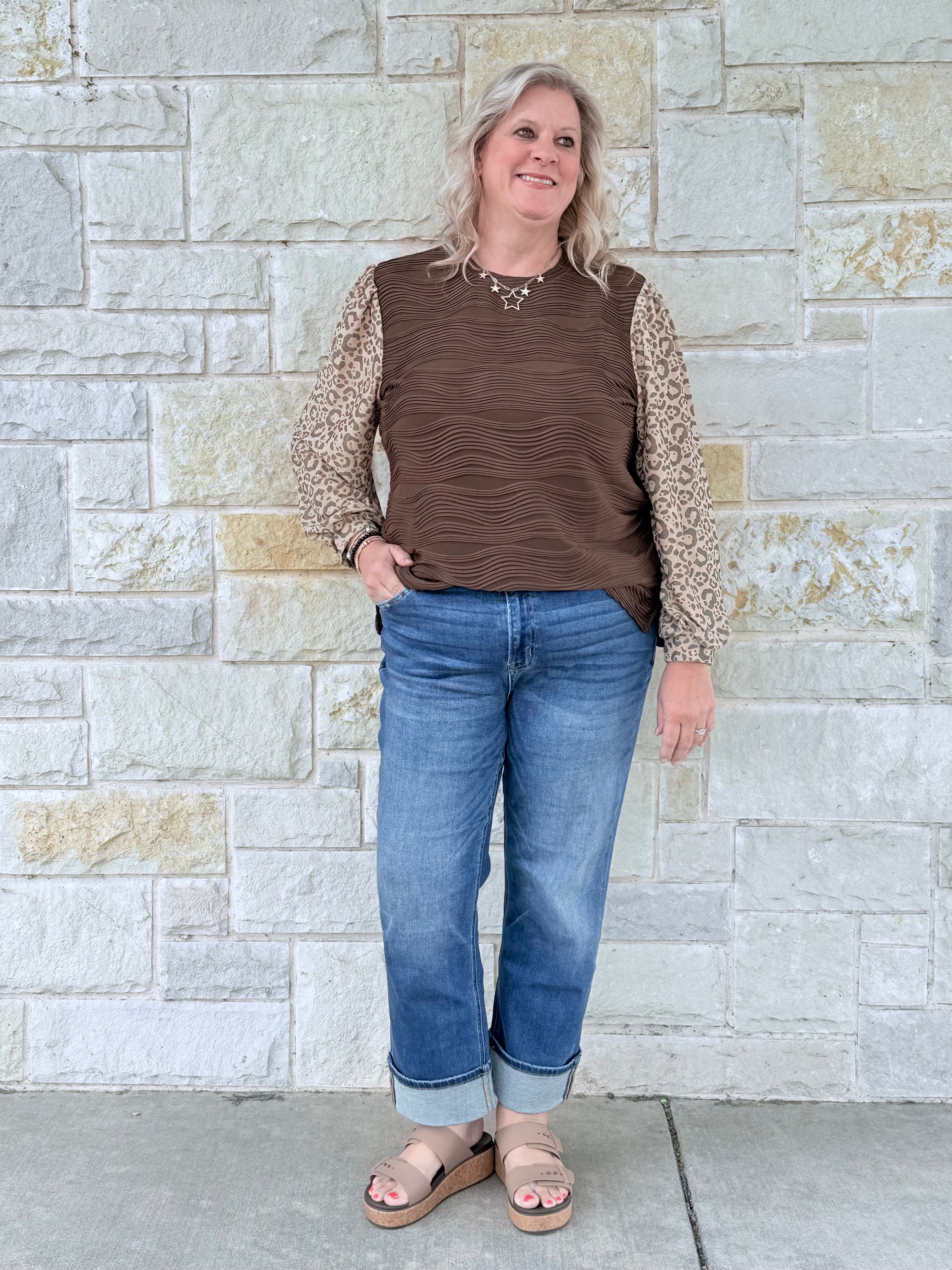Turn heads in this textured top featuring leopard print sleeves — the perfect mix of cozy and bold. Dress it up or keep it casual, either way you’ll look amazing!