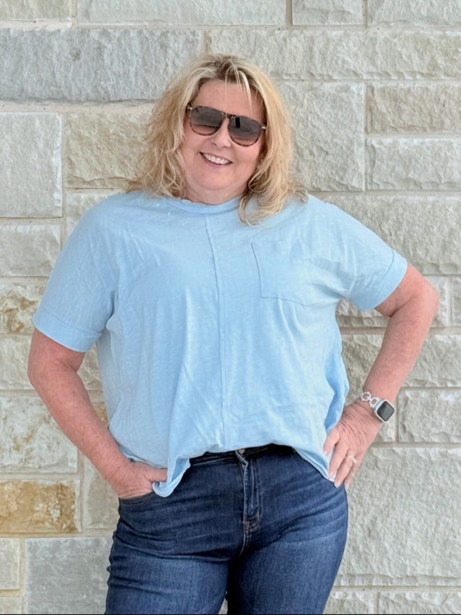 Enjoy all-day comfort and effortless style with this cotton slub knit top. Crafted from soft, breathable fabric, it offers a relaxed feel that’s perfect for everyday wear. A classic round neckline and front pocket add simple yet stylish detail, making this an easy, versatile essential. Whether layered or worn on its own, it’s the perfect basic you’ll reach for all season long.