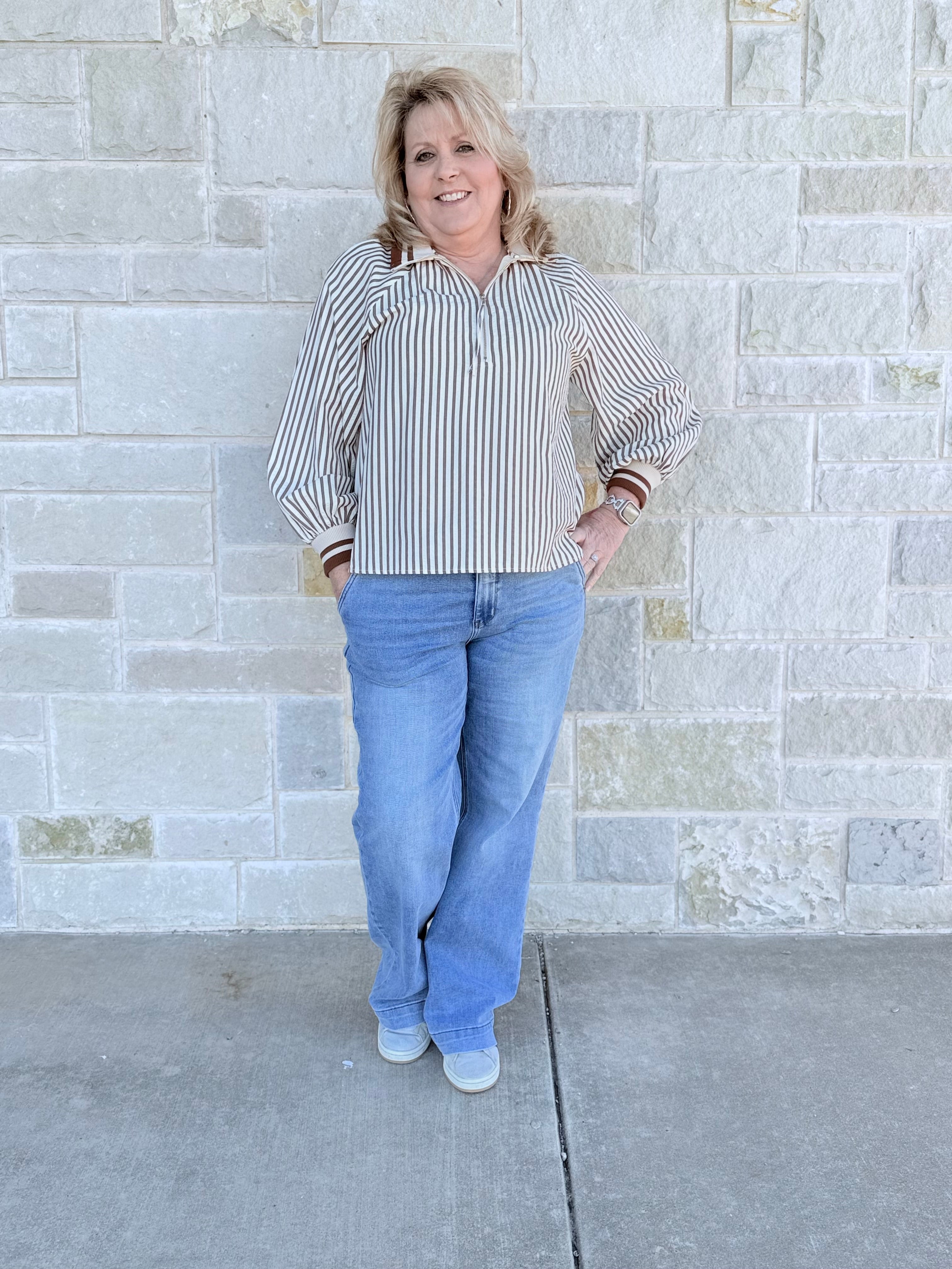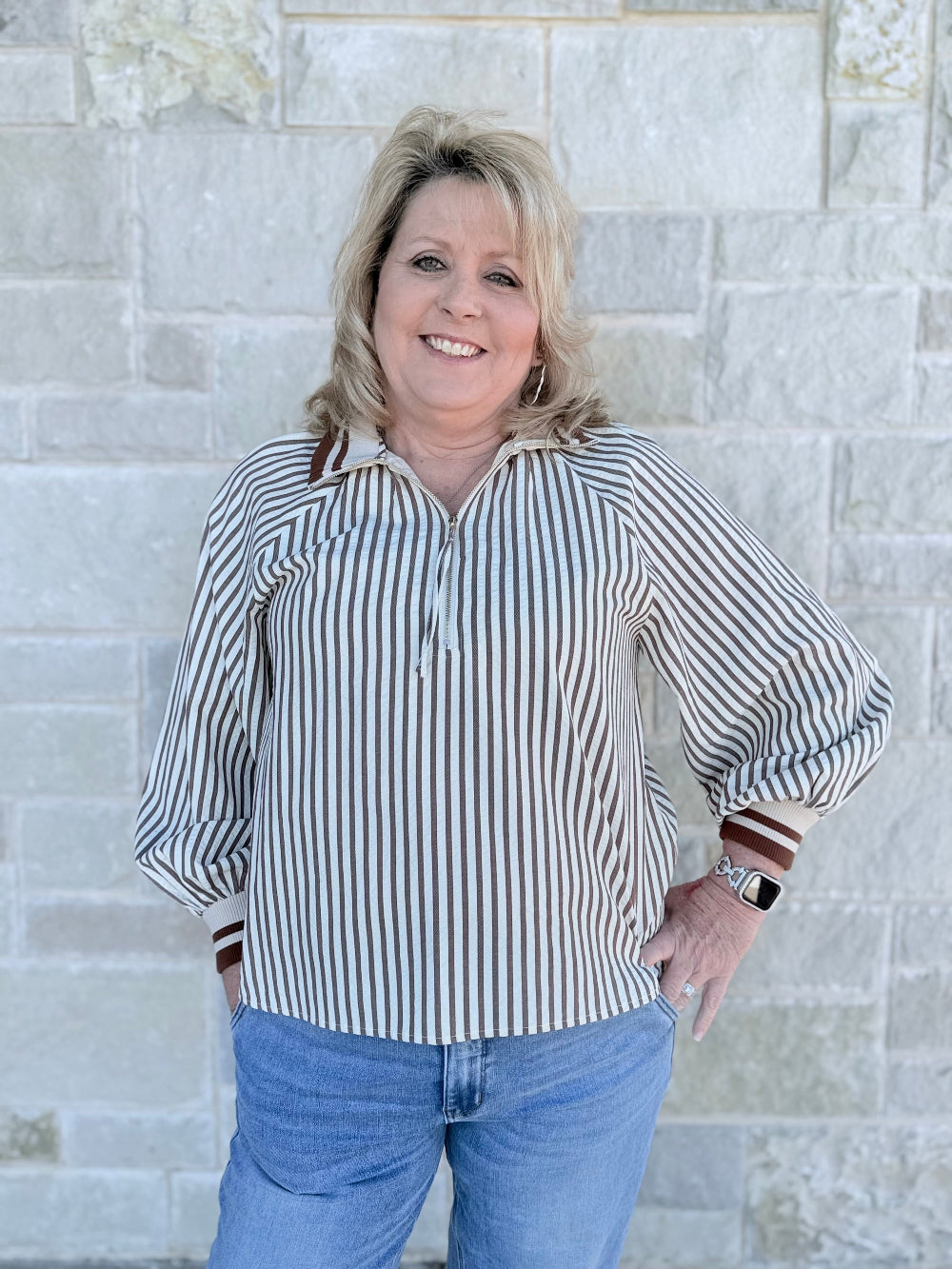 This Entro Striped Long Sleeve Top features a ribbed spread collar and stylish quarter zip for a casual yet polished look. Lightweight and easy to wear all season long!