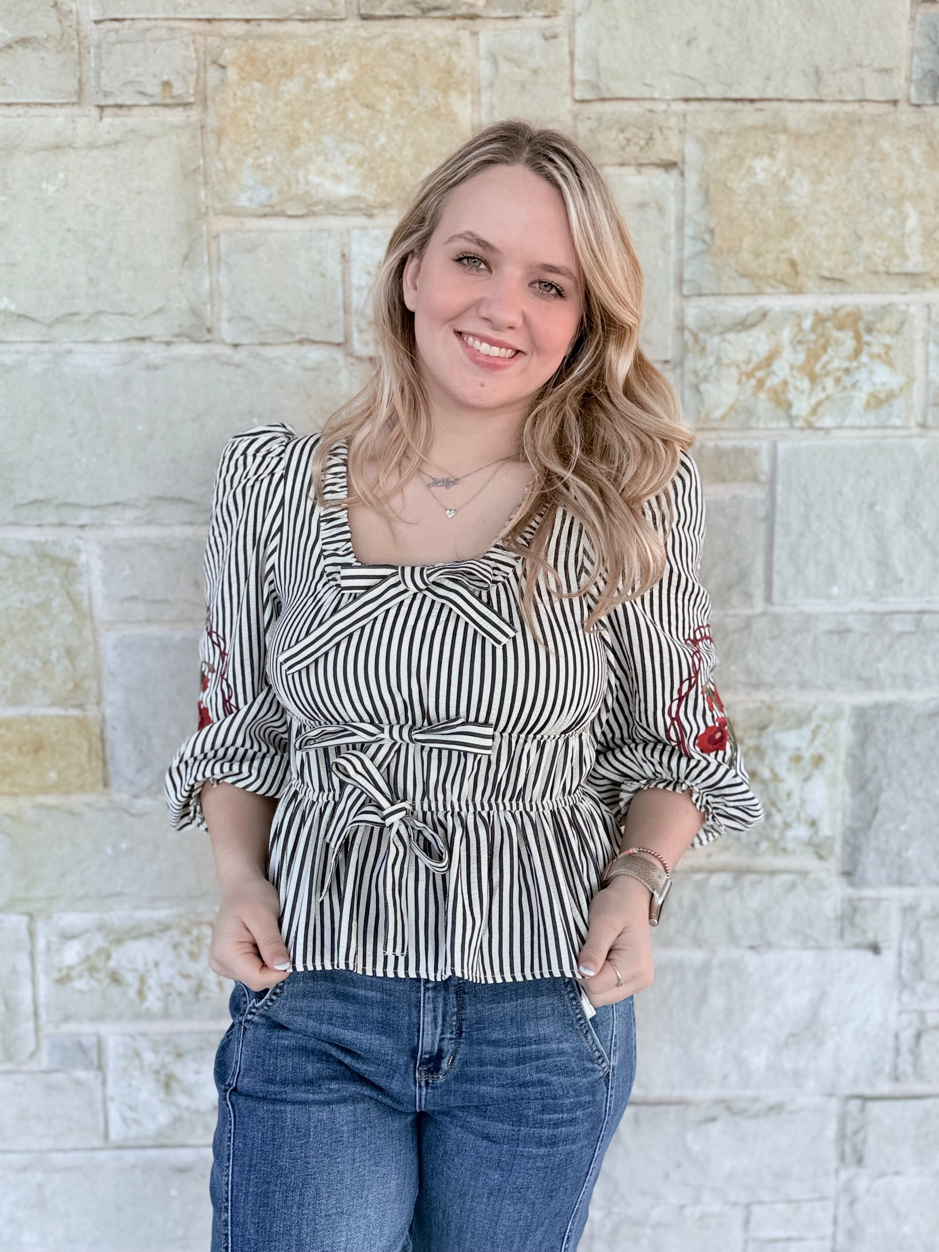 We’re loving this Striped Peplum Top by Entro — complete with floral-embroidered sleeves, self-tie detail, and an easy, flowy fit. Perfect for adding a soft, feminine touch to your look.