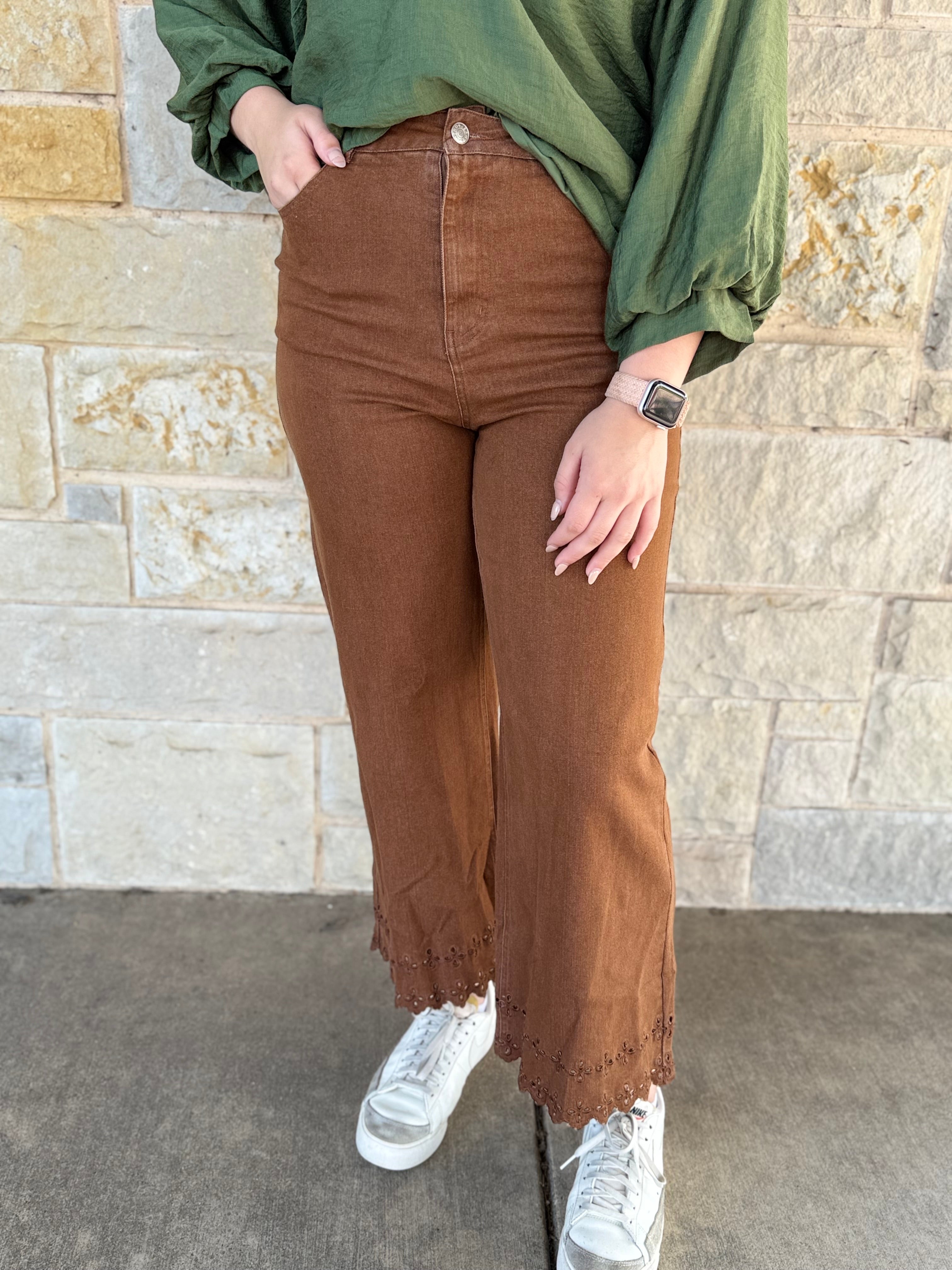 Elevate your ensemble with these high-waist ankle-length pants, meticulously designed with a delicate floral embroidered border hem. Featuring a classic button fly-front zipper closure and traditional jean pockets, they blend timeless style with refined details. Crafted from lightweight, woven fabric, these non-sheer pants offer comfort and sophistication for any occasion. Unlined for a streamlined fit, they promise effortless elegance from day to night.