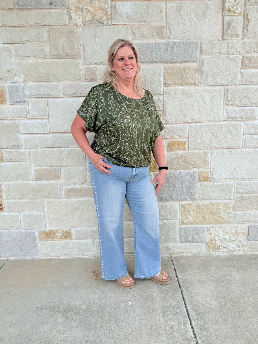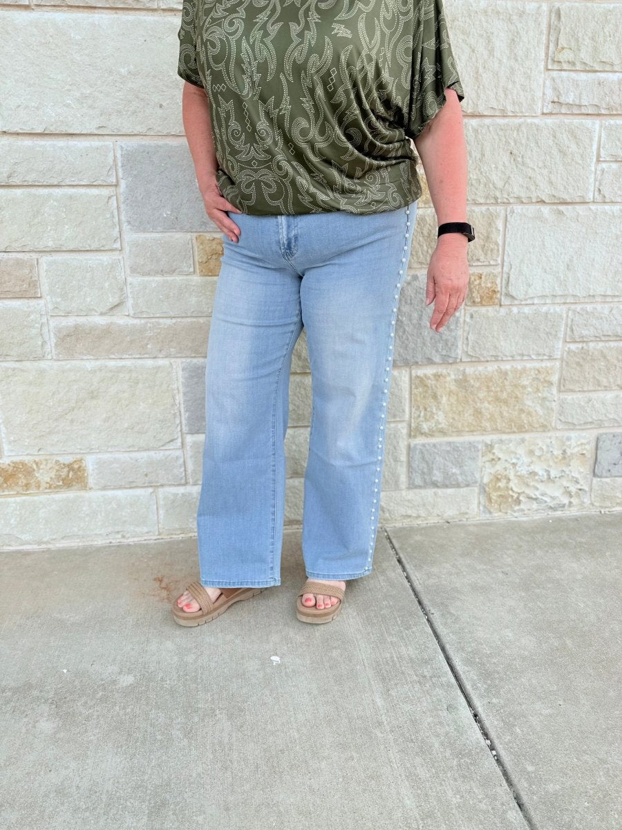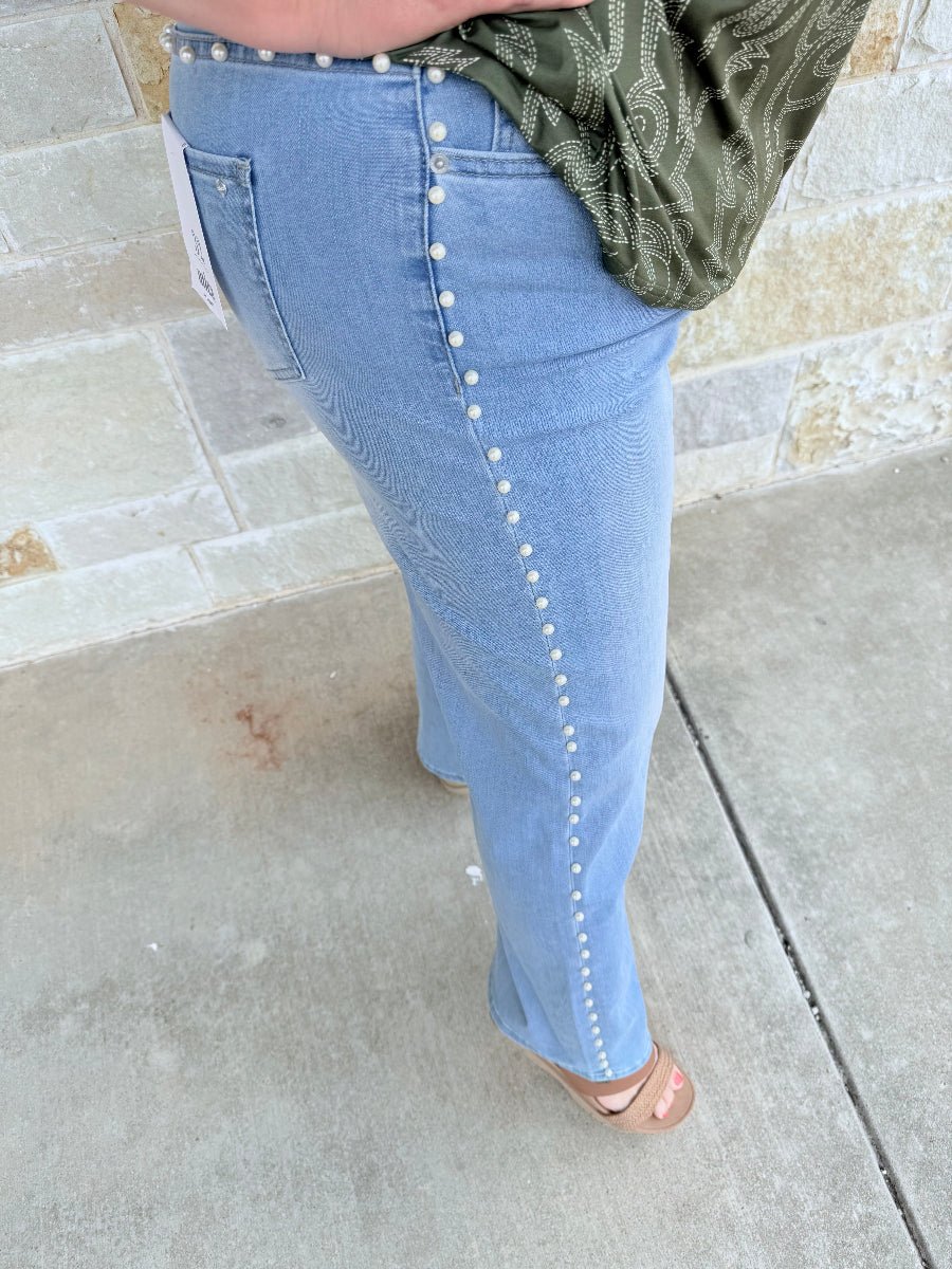 Elevate your denim collection with these stunning high-rise wide-leg jeans featuring exquisite pearl embellishments for a touch of luxury. Designed to flatter your silhouette, this statement piece perfectly blends vintage-inspired charm with modern, high-fashion appeal.