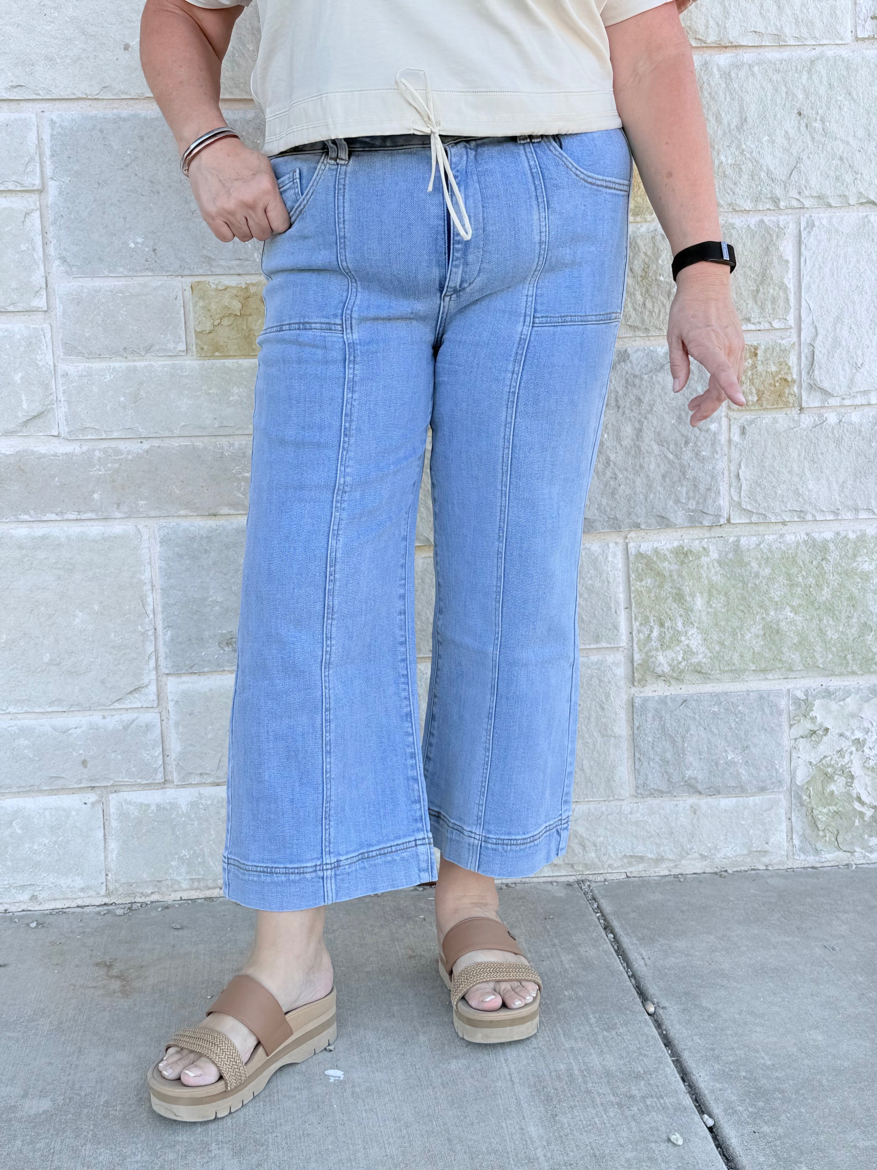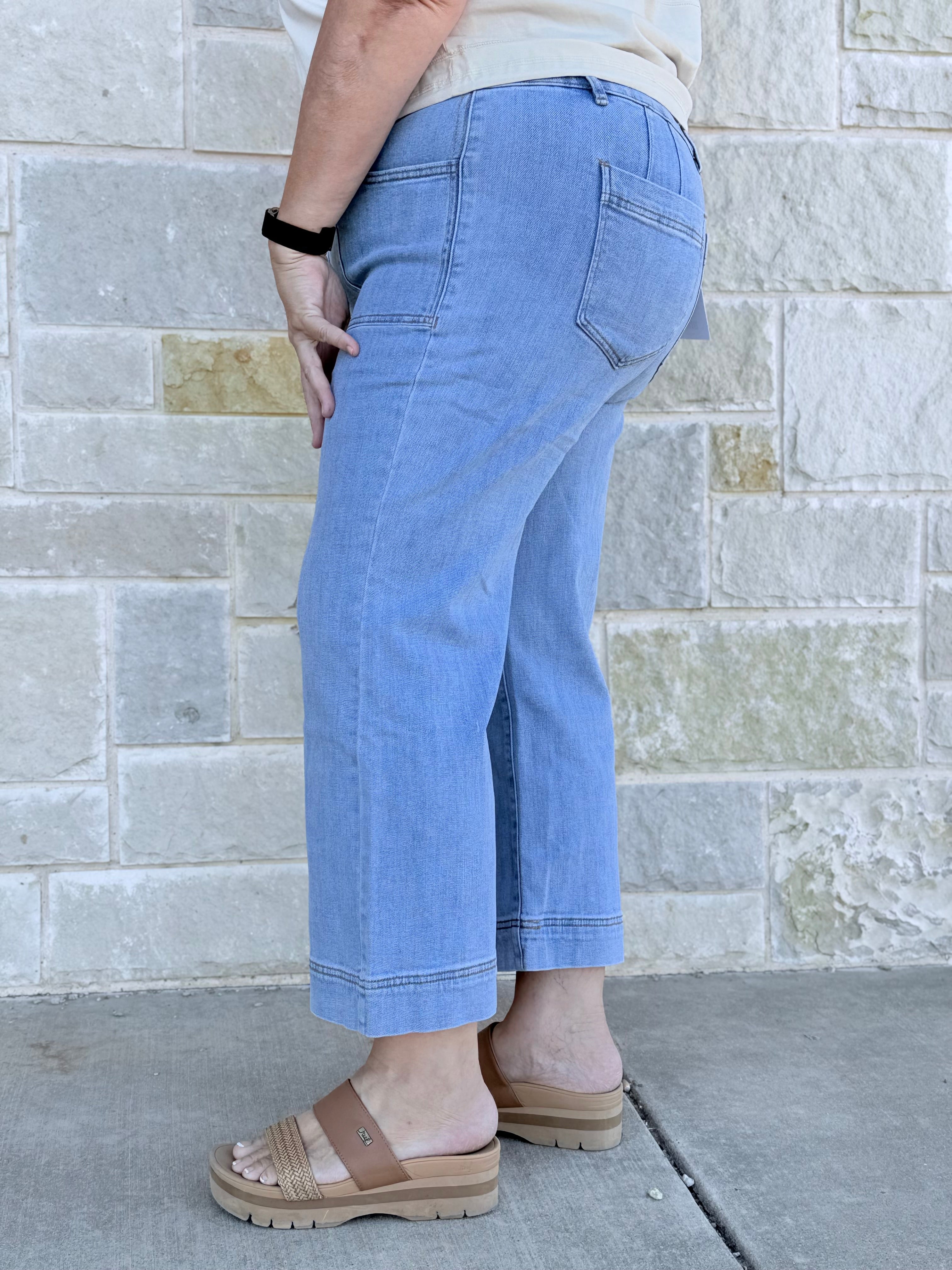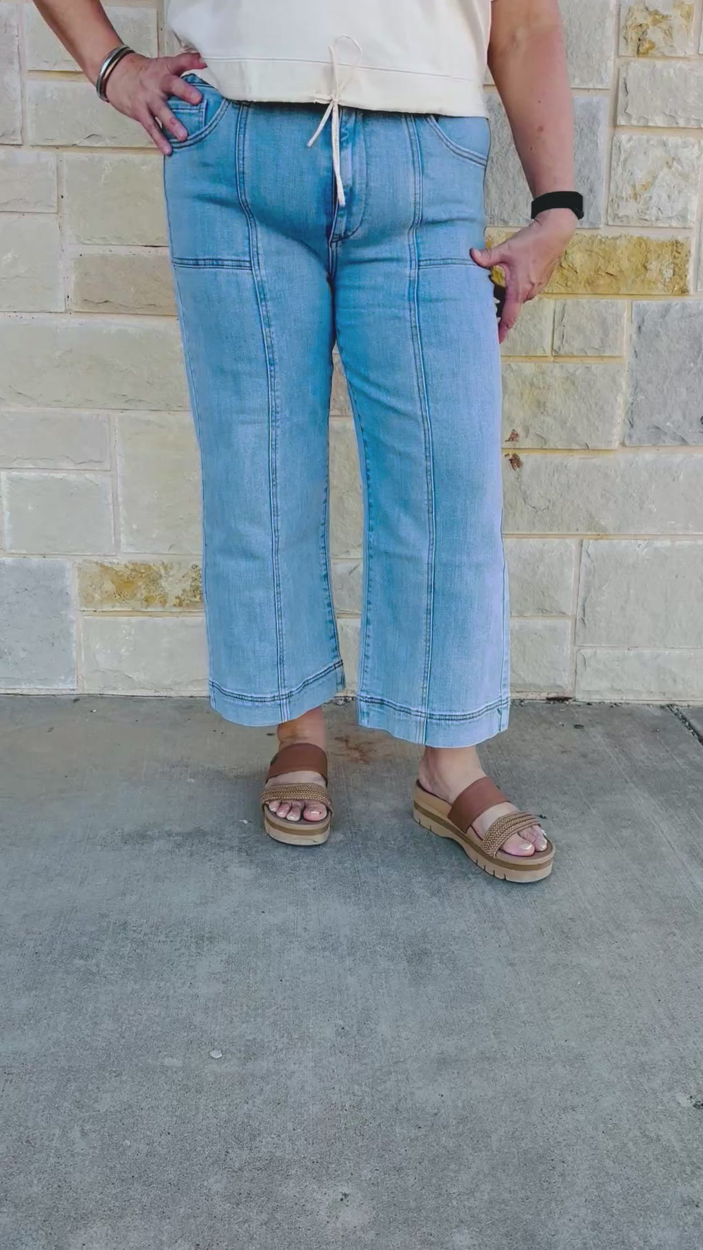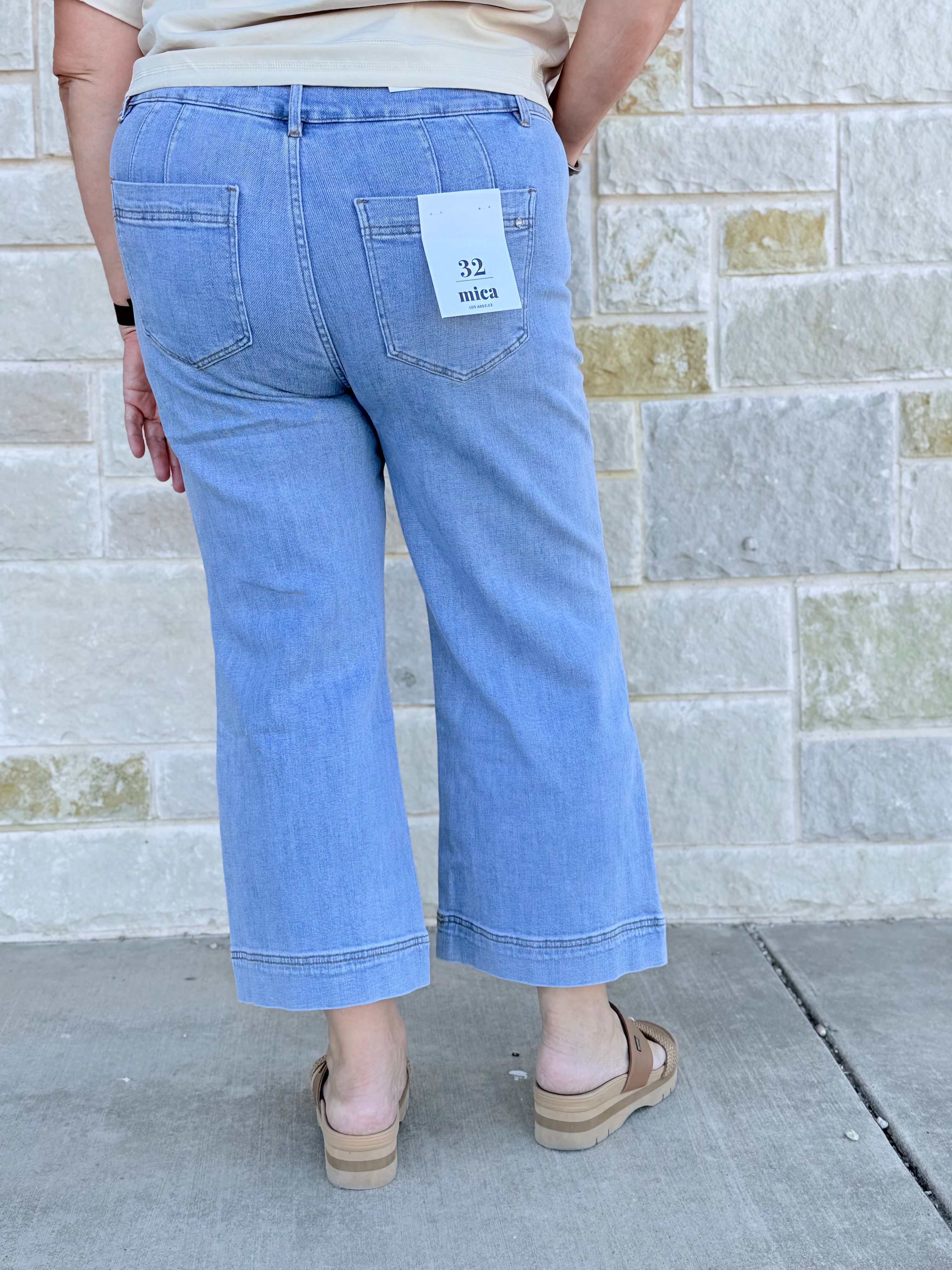 Elevate your denim game with the Mica Super High Rise Wide Crop. Featuring accent pockets, a wide hem, and a sleek line down the leg, these jeans blend structure with style for a flattering, modern silhouette. Pair them with your favorite blouse or a cozy sweater for effortless sophistication. 💙