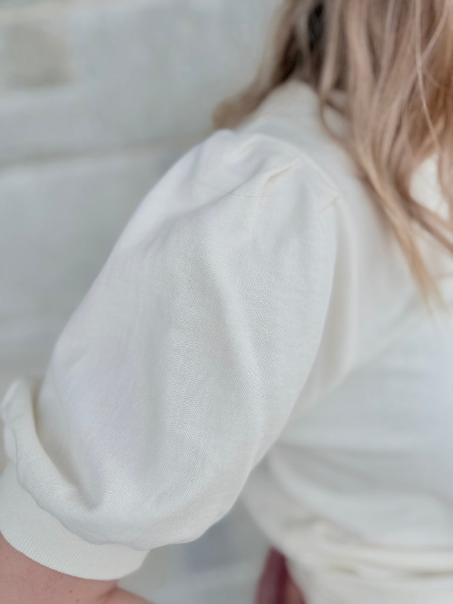 Elevate your everyday rotation with this premium French terry top, featuring dramatic sculptural puff sleeves and a vintage-inspired stone wash finish. The modern boxy silhouette and refined V-stitch detail create an effortlessly chic look that pairs perfectly with high-waisted denim.