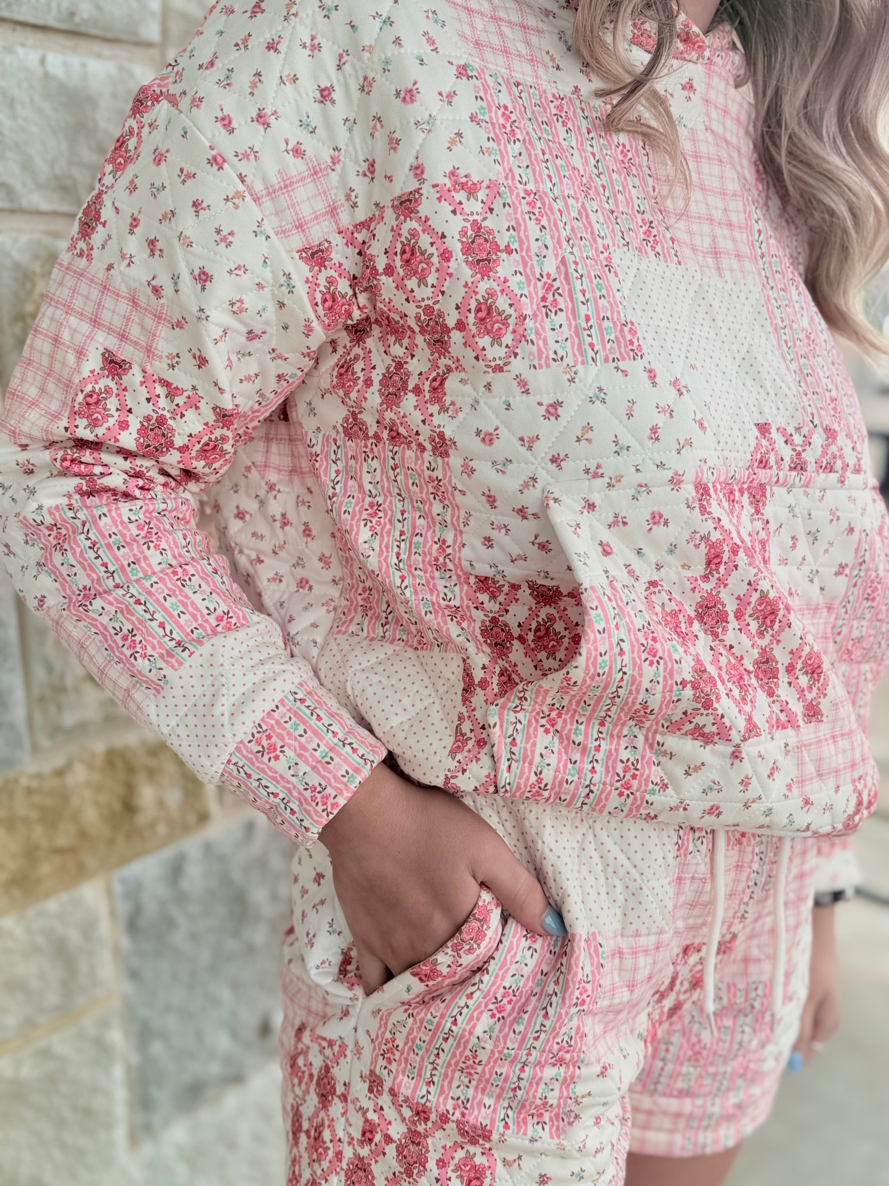 Addie Mae Pink Quilt-Pattern Hoodie & Shorts Loungewear Set