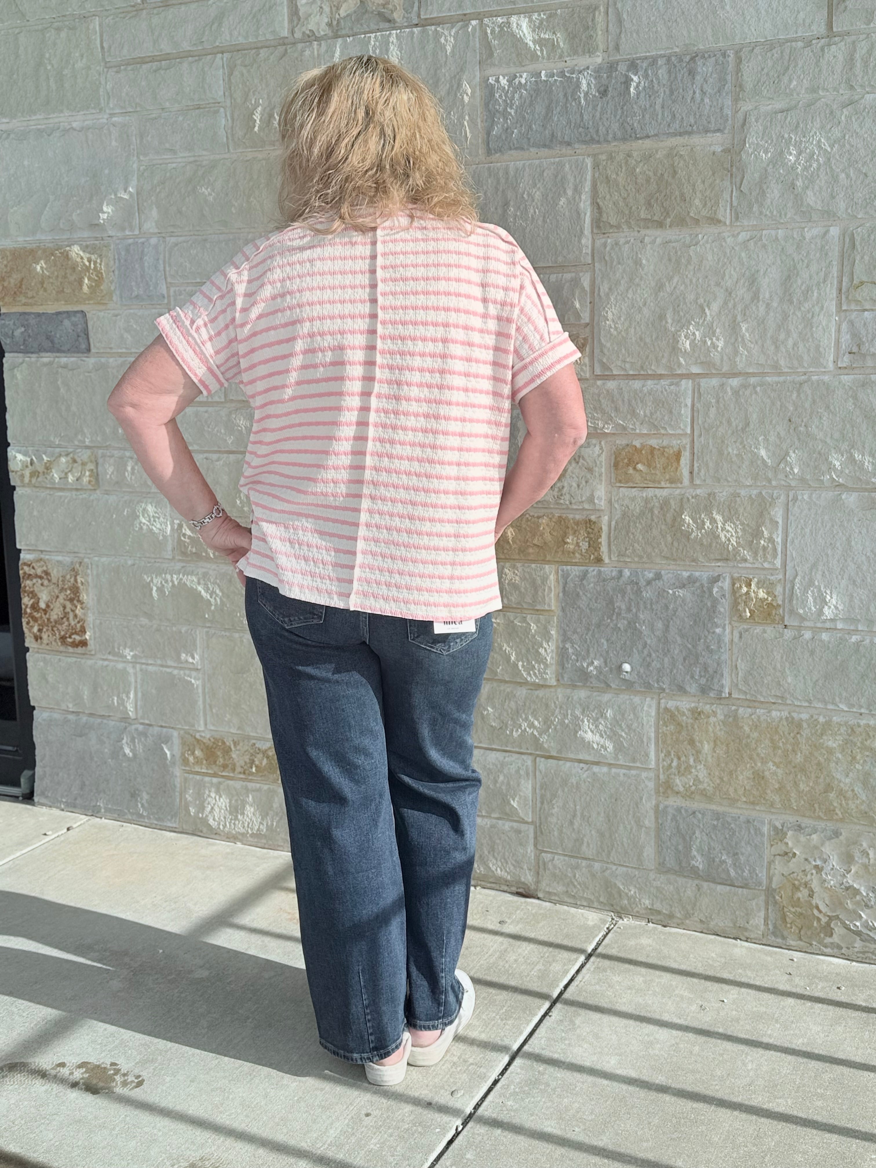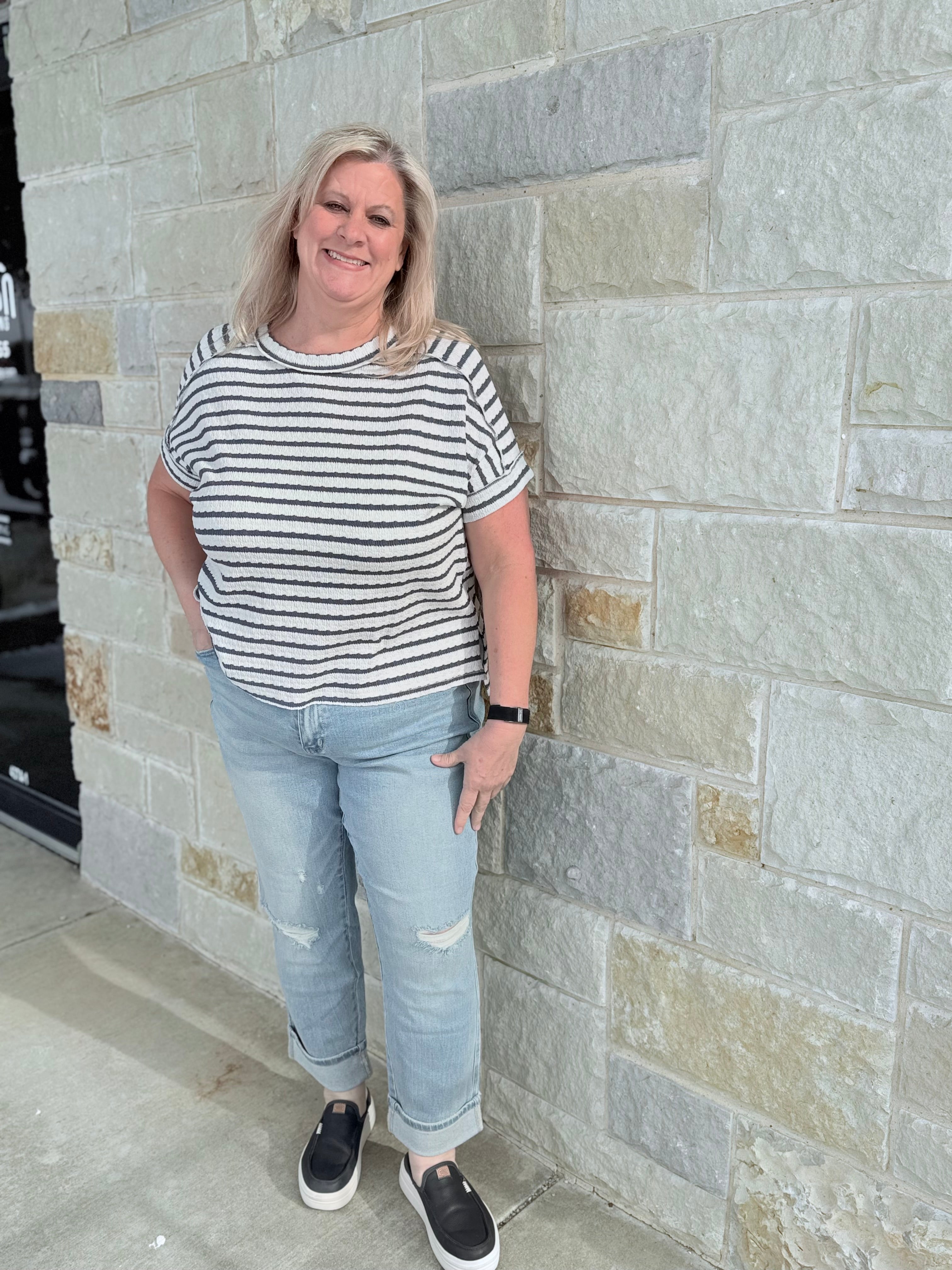 Elevate your casual wardrobe with this striped jacquard box tee—a modern take on a timeless classic. The textured jacquard weave adds visual interest and dimension, while the relaxed box silhouette delivers effortless comfort and style. Perfect for layering or wearing solo, this round-neck essential pairs seamlessly with everything from jeans to tailored trousers. Soft, versatile, and undeniably chic.