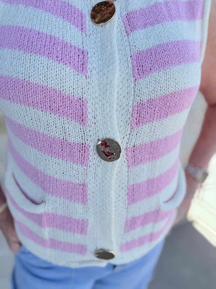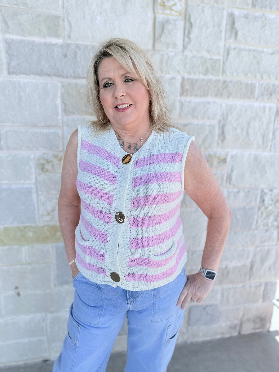 Elevate your transitional wardrobe with the Marina Striped Knit Sweater Vest. This versatile sleeveless button-down combines a classic preppy aesthetic with modern boutique style. Crafted from a soft, premium knit, it features timeless horizontal stripes and a functional button-front design. Whether you’re layering it over a crisp collared shirt for the office or wearing it solo for a breezy weekend look, this vest is the ultimate "clean girl" staple for year-round styling.