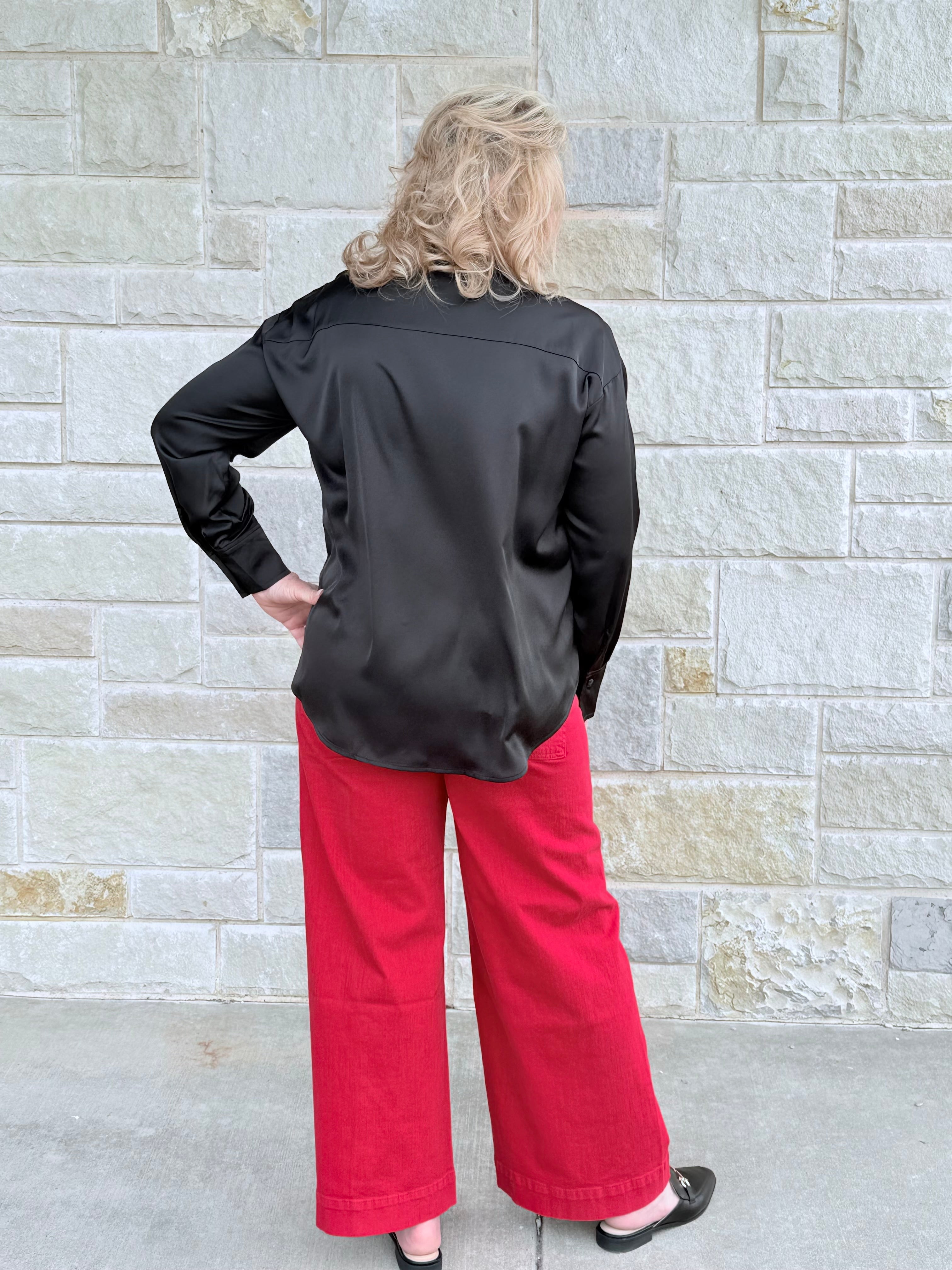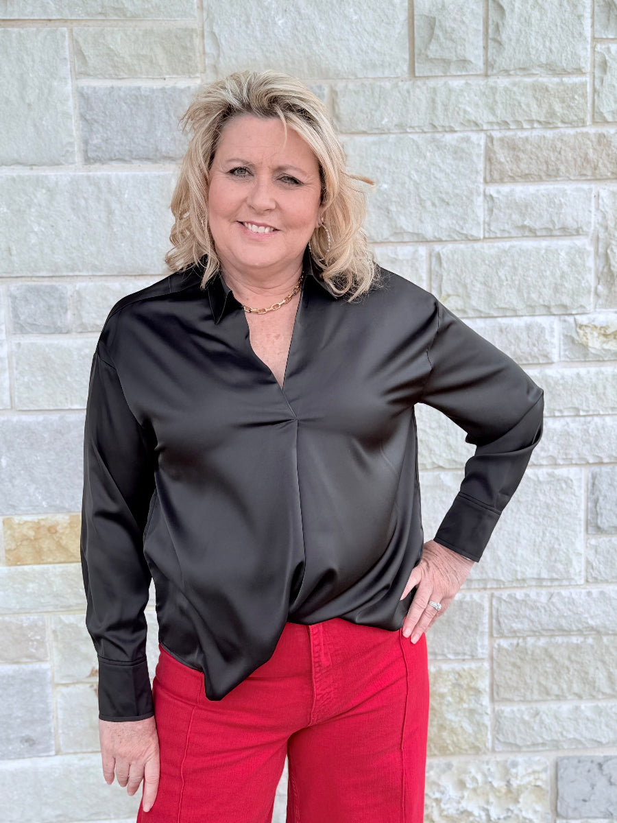 Effortlessly elevate your wardrobe with this luxurious, high-shine satin blouse. The flattering V-neck and relaxed fit offer a perfect blend of sophisticated style and all-day comfort. Seamlessly transition from the office to a night out in timeless elegance.