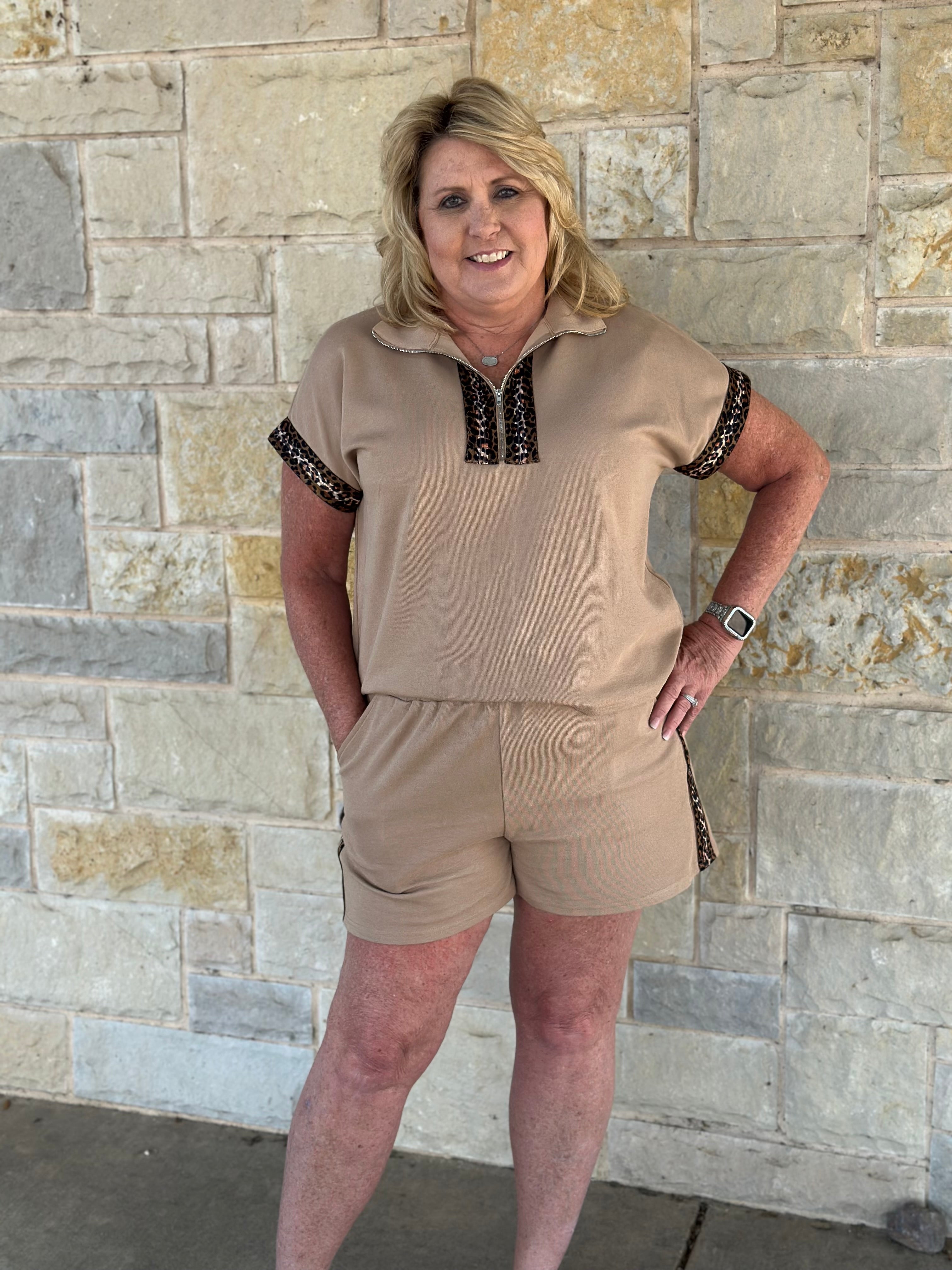 Elevate your casual wardrobe with this coordinated set featuring a drop short sleeve half-zip knit top and waist-elastic knit shorts. Both pieces are accented with stylish leopard contrast tape, adding a refined edge to comfortable, breathable fabrics. Perfect for effortless sophistication in relaxed settings.