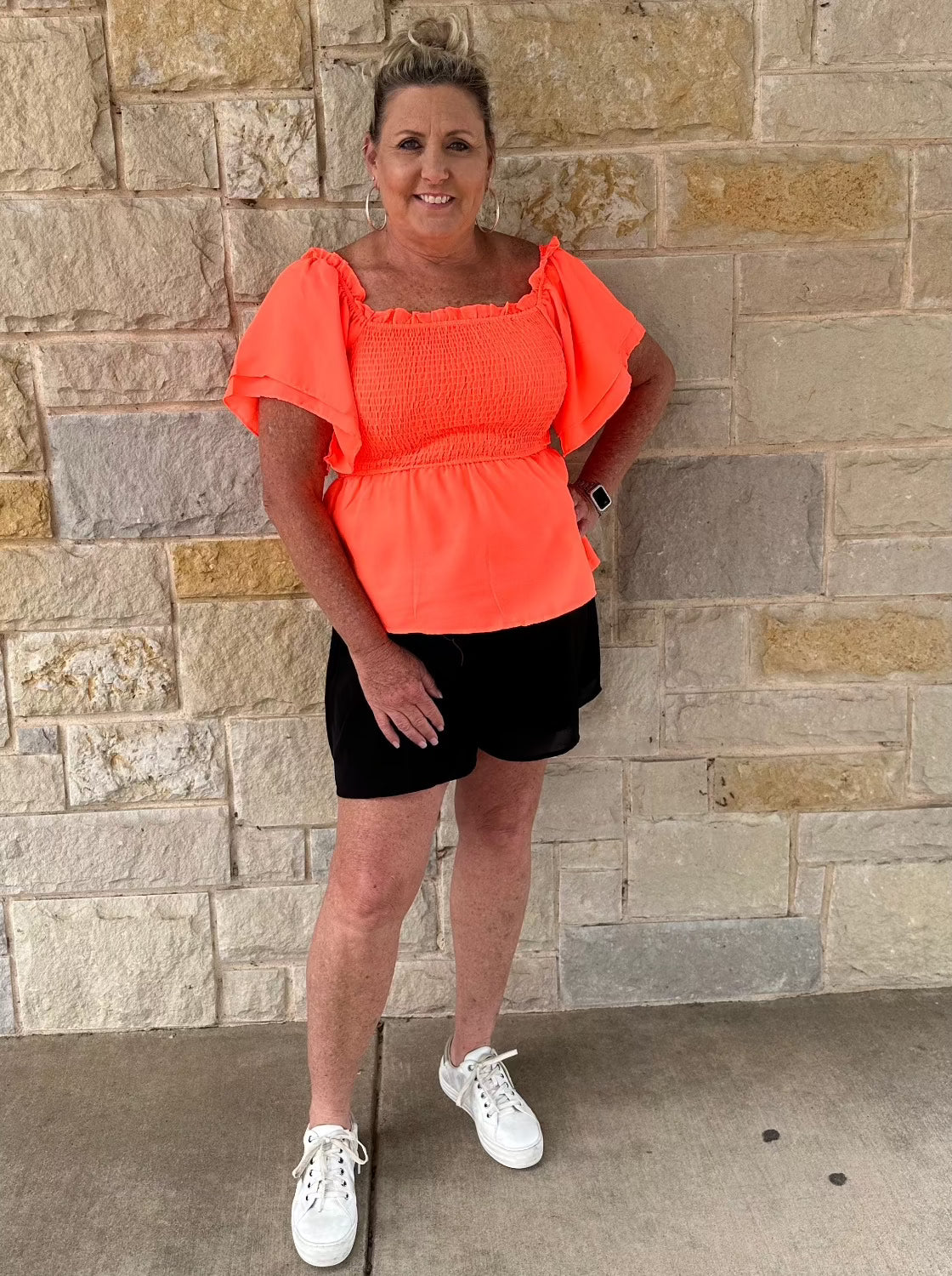 This smocked top features stylish ruffle sleeve design that adds a touch of fun to any outfit. The smocking provides a flattering fit with a flowy comfortable fit towards the bottom.