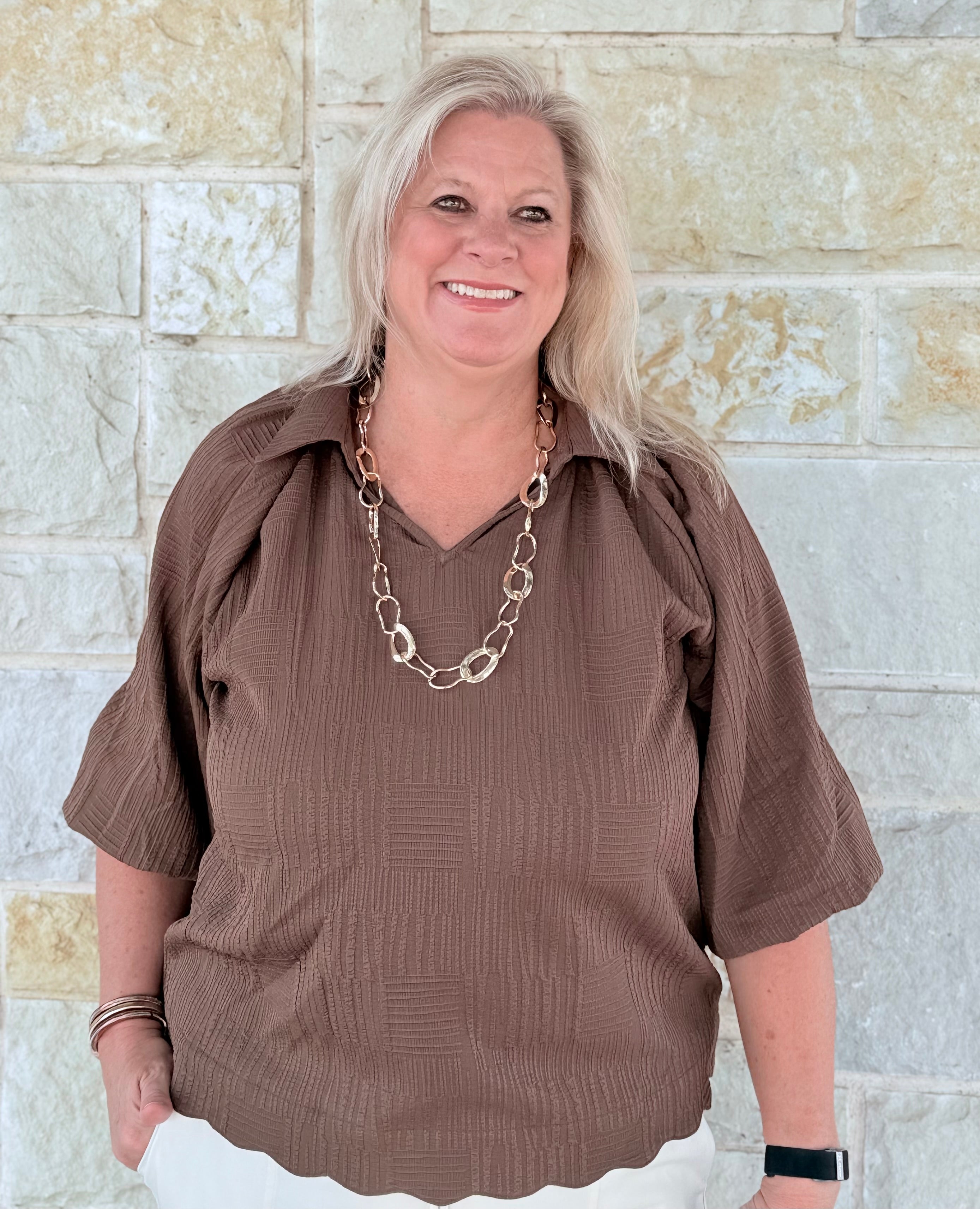 Elevate your wardrobe with the Umgee Textured V-Neck Collared Blouse, showcasing a refined blend of style and comfort. Featuring a collared V-neck cut and wide 3/4 batwing sleeves, its relaxed, flowy silhouette offers effortless elegance. The delicate scalloped hem adds a subtle, sophisticated detail. Lightweight and unlined, this blouse is perfect for layering or wearing on its own in warmer weather. Ideal for both professional and casual settings, it seamlessly combines modern design with timeless appeal.