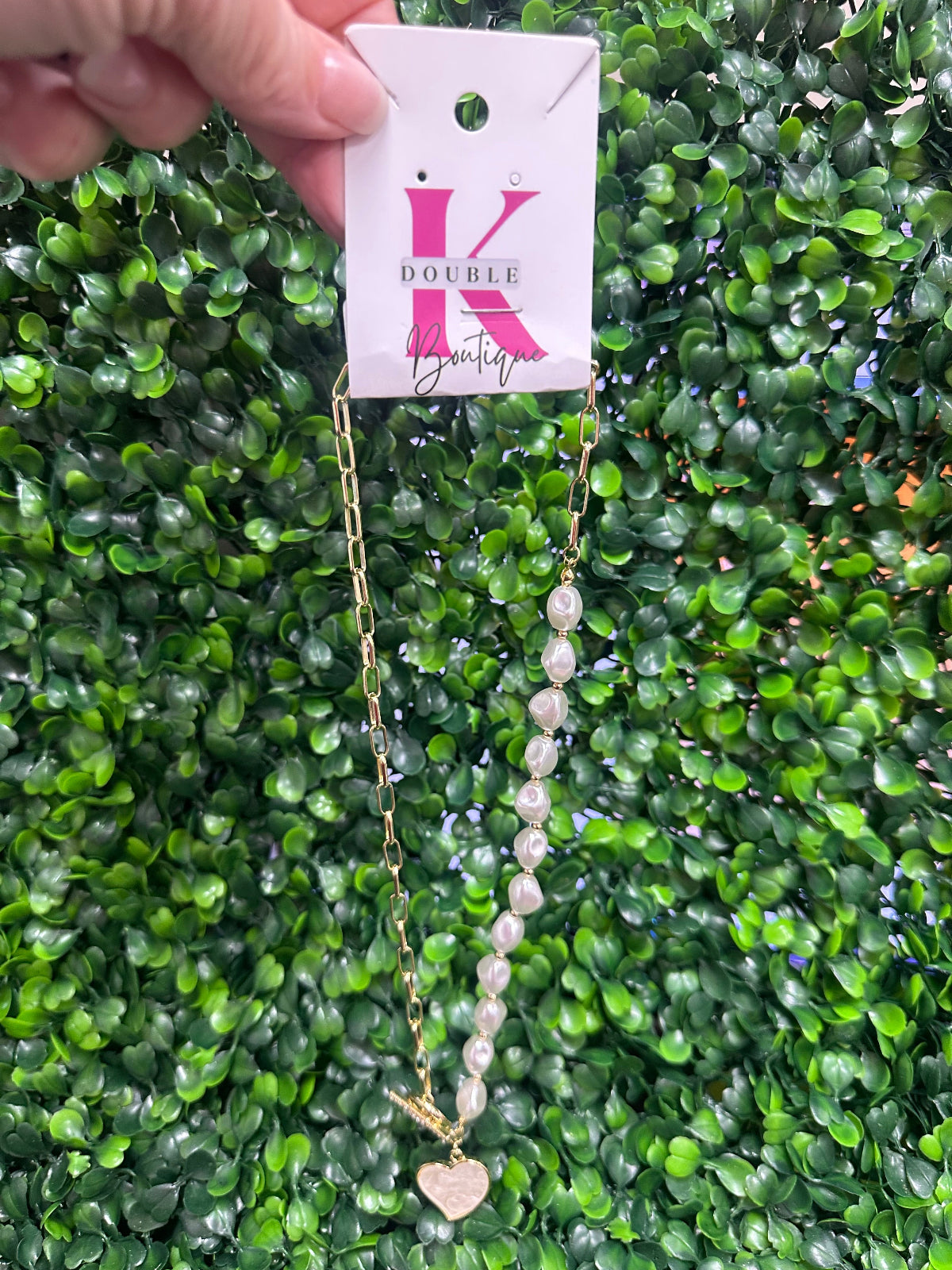 "Enhance your elegance with our Heart Pendant Rhinestone Pearl Chain Necklace. The luxurious gold heart pendant is adorned with sparkling rhinestones and a delicate pearl chain. Elevate your style and exude sophistication with this exquisite necklace."