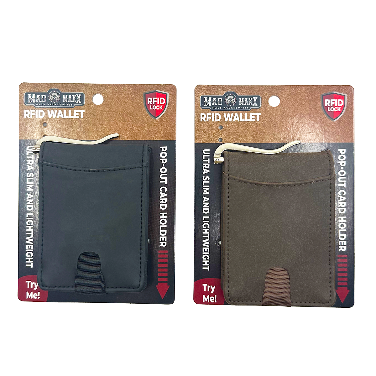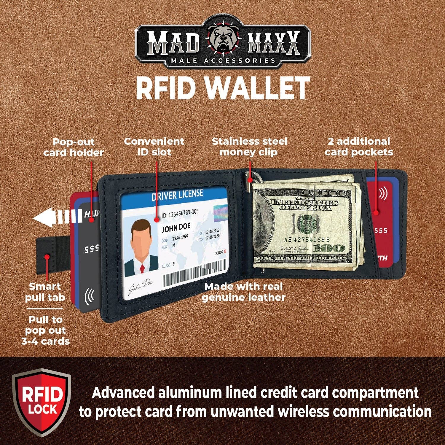 Mad Maxx Leather Wallet featuring RFID protection — tech-savvy thieves might use an RFID reader to scan the information from your credit card — The purpose of an RFID wallet is to block these radio waves. Holds up to six(6) cards. Ultra slim and light with additional compartments for cash, drivers license, etc. Smart pull tab – pull to pop out 3-4 cards.